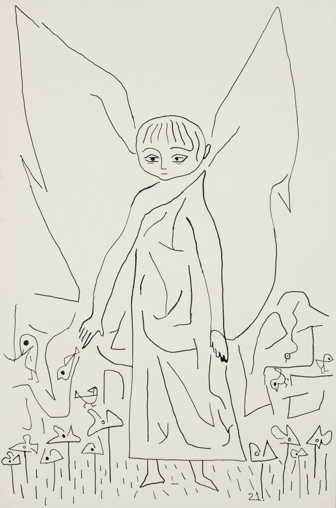Angel Crying with Bird, 2019. Ink on paper, 19 x12”, 22 x 16” framed